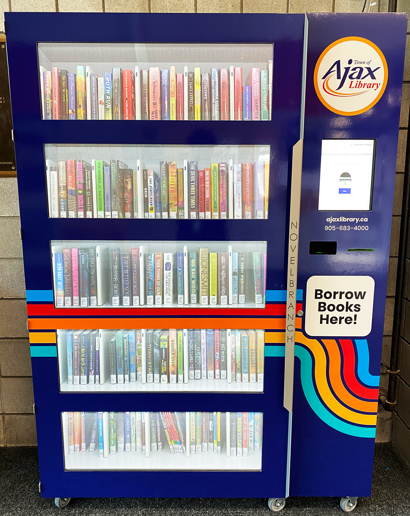 The Library has a NovelBranch Vending Machine at the Ajax Community Centre, near the north entrance! Inside you'll find popular adult, teen, and children's books to borrow anytime the ACC is open. You can also return items to the machine. All you need is your Ajax Public Library card!