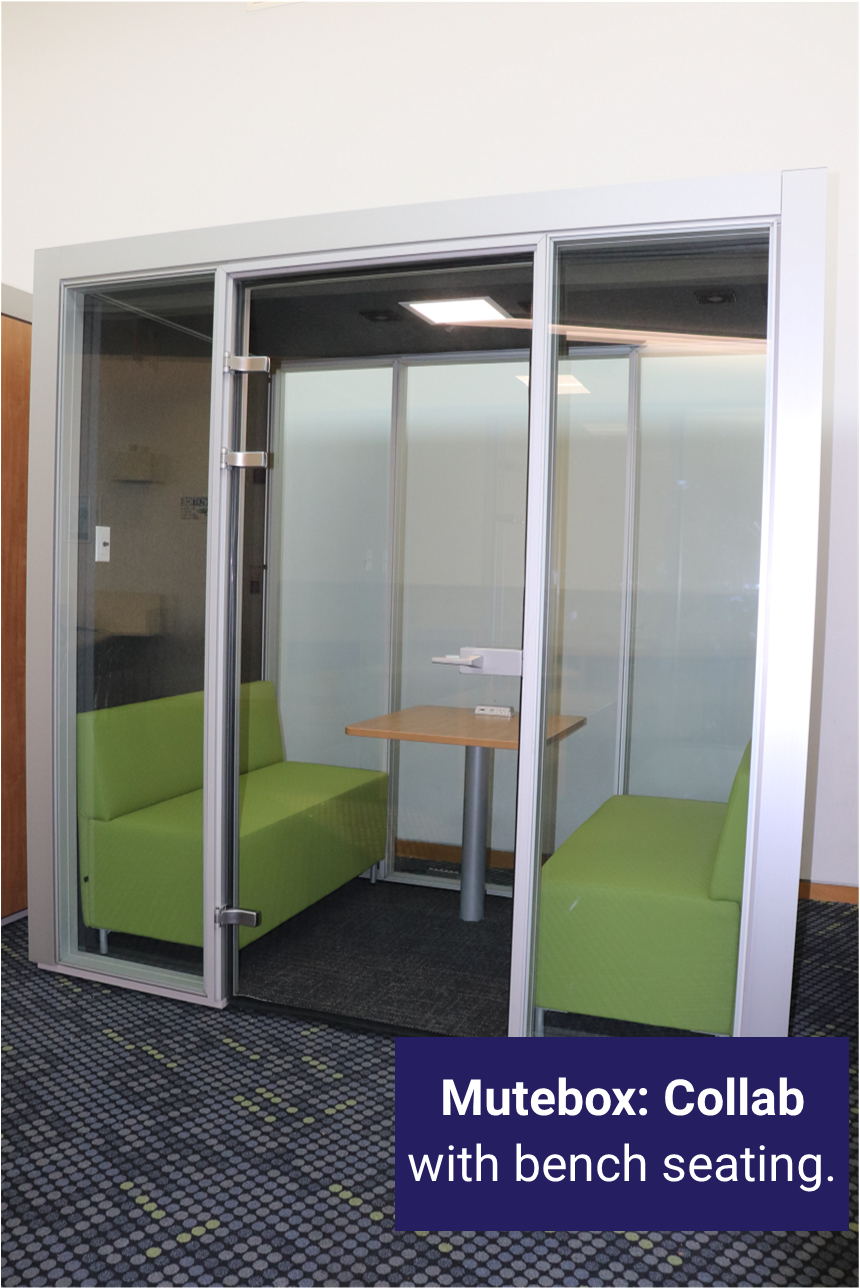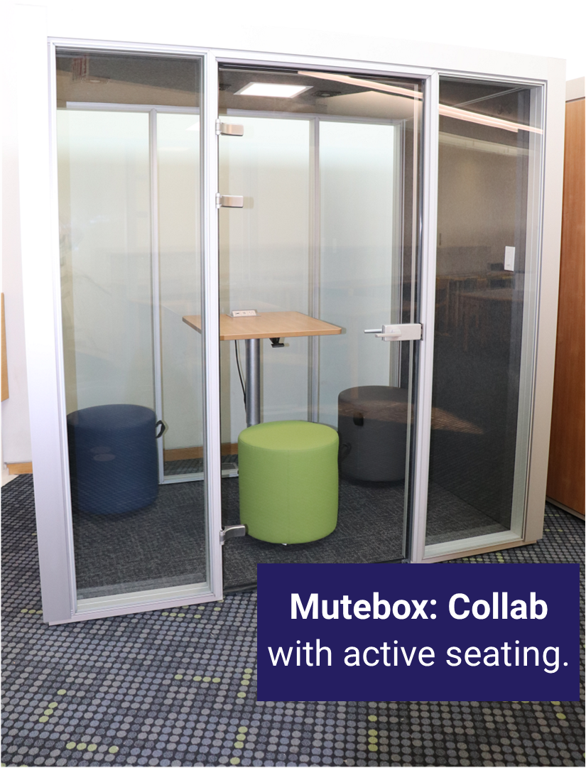 These two (2) collaborative suites are designed for a group of up to four (4) people each to share with an adjustable table and either active or bench seating. Insulated walls help dampen noise transfer; power outlets are available.